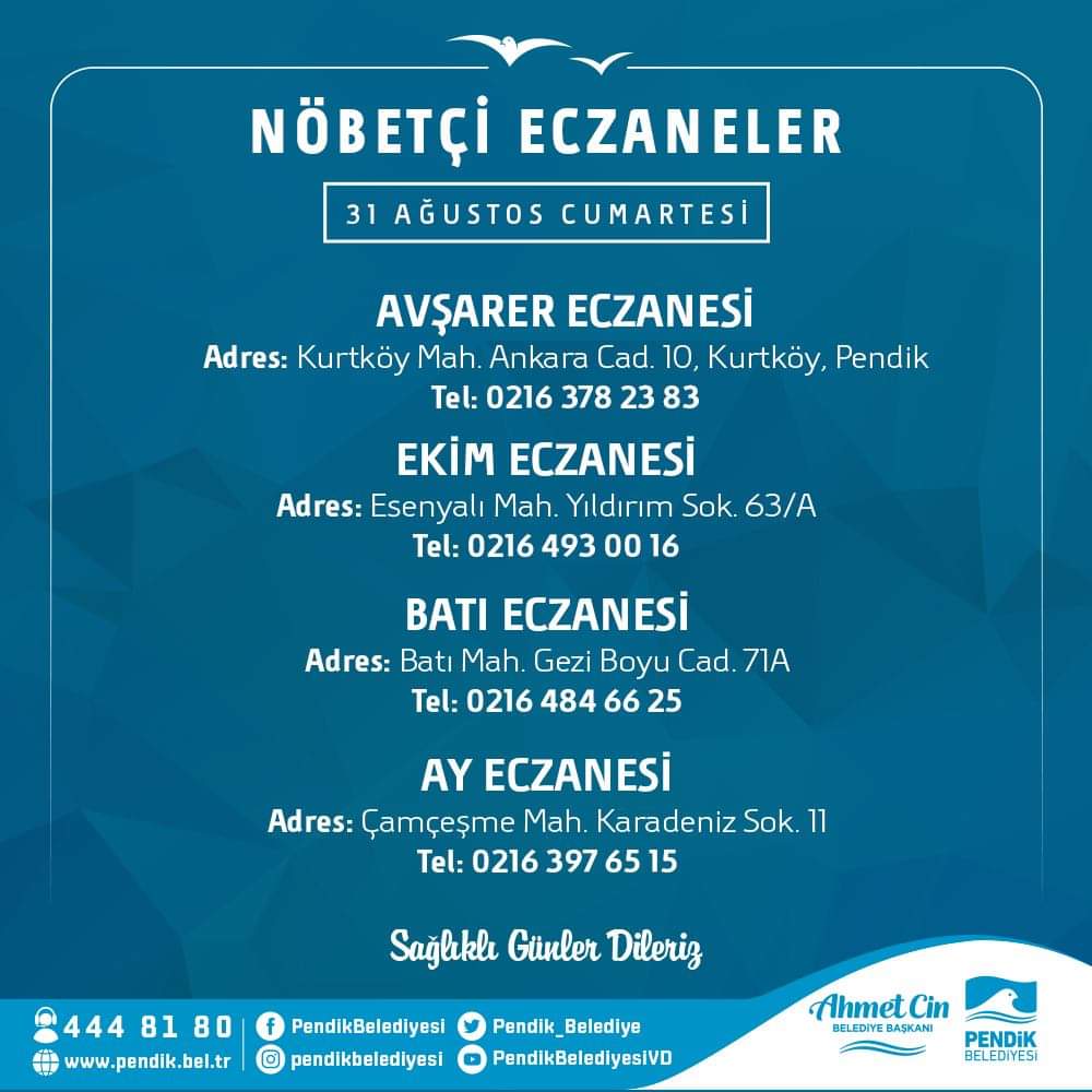Pendik Belediyesi Maskemesafetemizlik على تويتر Tum Hastalara Acil Sifalar Tum Eczacilarimiza Iyi Nobetler Diliyoruz Bugun Pendik Te Nobet Tutacak Eczaneler Icin Gorseli Inceleyebilirsiniz 31 Agustos 2019 Cumartesi Saglikli
