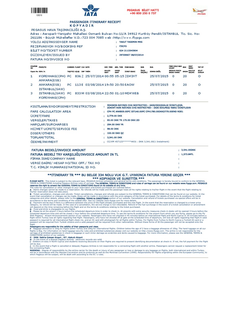 Elektronik Bilet Yolcu Seyahat Belgesi Pegasus Hava